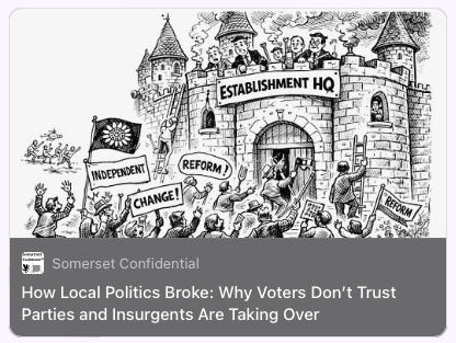 📣 Speaking of politics - and trust - this piece by Barry O’Leary, a former Parish and Mendip District Councillor, published by Somerset Confidential, is an astute diagnosis of local politics generally and well worth a read:
